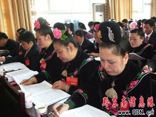 會場內花團錦簇,燈火輝煌,氣氛熱烈,莊嚴肅穆,十面鮮艷的紅旗擁著主席臺帷幕中央高懸的國徽。“高舉發展、團結、奮斗的旗幟,充分發揮‘創業求好、拼搏求快、創新求精、團結求和’的雷山精神,排難而進,再接再厲,為雷山更加輝煌燦爛的明天而努力奮斗”的橫幅格外醒目。出席本次大會的全體代表匯聚一堂,莊嚴履行憲法和法律賦予的神圣職責。
