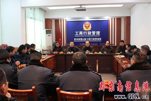 省工商局副局長王勇一行首先觀看了該局2011年工作圖片展、創先爭優、三個建設年、四幫四促”活動,并聽取該局局長隆曉明的匯報,對取得的成績給予了充分肯定,提出:雷山縣工商局在以黔東南州工商局楊秀海同志為班長的局黨組領導下,認真落實州局、縣委縣政府的決策部署,以省局提出的“12345”工作思路,抓好六項工作:加強節日市場監管,加大對各類批發市場、超市和農副產品市場中糧、油、肉等居民消費必需品的檢查執法力度;充分發揮12315行政執法網絡的作用,及時受理消費者投訴舉報;嚴格查處以假充真、以次充好、缺斤短兩、囤積居奇、哄抬價格等擾亂市場秩序的行為,健全市場監測預警制度,加強市場動態監測,落實糧油等重要商品市場監管應急預案;規范廣告市場,突破監管難點,推進監管與執法、監管與維權的統一,開展清理整頓部分商品濫用“特供”、“專供”標識專項行動;抓好“紅盾護農”七大機制的貫徹落實,加大力度服務農村改革發展;凡是市場準入、打假、維權等涉及工商職能有關的工作,都要依法開展好、落實好,為地方經濟發展服務好。