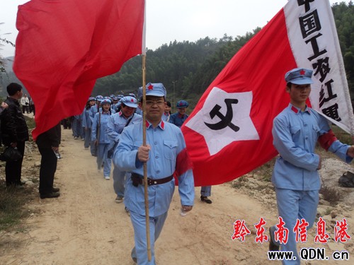 本港訊 (韋運安 特約記者 唐學章 攝影報道)今年是中央紅軍長征進入侗鄉黎平76周年。為弘揚紅軍長征精神,加強國防教育、愛國主義教育和革命傳統教育,推進“踐行宗旨教育”及創優爭先活動,建設美好的侗鄉革命老區,10月22日,中共黎平縣直屬機關工作委員會組織62名支部書記、黨員和入黨積極份子,開展一次重走紅軍長征路活動。活動線路是當年紅軍長征戰斗經過的中潮鎮佳所村——平壩村——羊角巖——德鳳鎮汪家莊——黎平縣城,其中羊角巖是紅軍戰斗遺址。