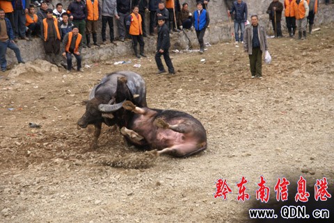本港訊 (記者 楊驥 攝影報道)3月5日,2010中國·凱里甘囊香國際蘆笙節民間斗牛賽繼續在甘囊香斗牛場進行,來自雷山縣郎德的29號牛“斗士”在比賽中兵不血刃,三場比賽中均將對方扣倒在地制勝,一舉奪得冠軍。更令人驚訝的是,這三場比賽用時加起來竟然不到一分鐘。