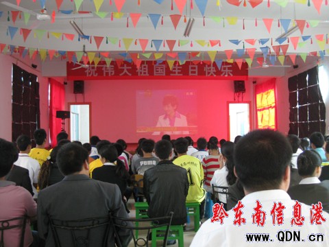 10月1日早上9時,黔東南州特殊技術學校的老師和60多名同學在二樓禮堂一同觀看祖國60年大慶的閱兵儀式。記者看到閱兵儀式還沒開始老師和同學們早已經來到禮堂準備好座椅等待著觀看閱兵儀式,從閱兵儀式前的報道到閱兵儀式開始,老師和同學都認真的觀看者。記者還看到一副醒目的橫幅“祝偉大祖國生日快樂”懸掛在前方,使得老師和同學們都沉侵到這濃濃的節日氛圍里。