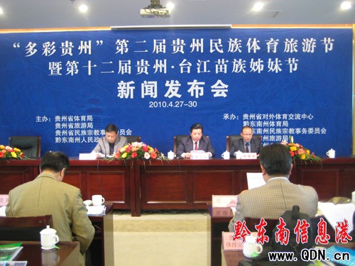 本港訊 (實習記者 鄭旭 攝影報道)4月19日,“多彩貴州”第二屆民族體育旅游節暨貴州臺江苗族姊妹節新聞發布會在貴陽召開。貴州省體育局、貴州省民族宗教事務委員會、貴州省旅游局、黔東南州和臺江縣相關負責人,中央駐黔媒體、貴州省級媒體及黔東南州新聞媒體,各旅行社負責人近80人參加了新聞發布會。