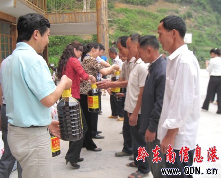 在捐贈(zèng)儀式上,出席捐贈(zèng)活動(dòng)的省、州、縣領(lǐng)導(dǎo)向受災(zāi)群眾發(fā)放大米、食用油等物資。