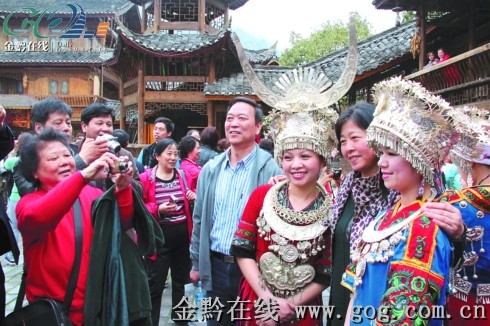外省游客爭著與西江苗寨姑娘合影。 蔣興勇 攝