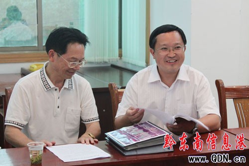 圖為黔東南州委常務副秘書長吳能福查看雷山縣工商局開展“三個建設年”活動等四方面六項工作活動圖片資料。(楊華 攝)