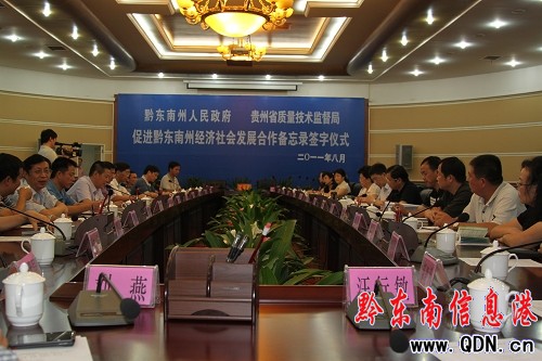 黔東南州州委常委、常務副州長馮仕文主持簽字儀式,副州長孫登峰就黔東南州與省質監局合作有關情況作匯報。州政府秘書長吳明、副秘書長楊秀學、省質監局12個處室負責人、州直有關部門以及中國質量報、黔東南有關媒體記者等60余人參加了簽字儀式。