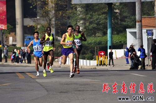 肯尼亞選手基普桑率先沖破第一賽段終點(張鴻 攝)