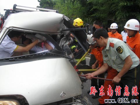 本港訊 (攝影 王紅貴 記者 楊驥)8月30日中午13時許,凱(里)施(秉)公路施秉境內新橋路段發生一起交通事故,一輛面包車與一輛大客車迎面相撞,面包車車頭嚴重變形,導致該車駕駛員被困于駛室內。接報警的施秉消防隊員火速趕來,利用多種救援工具,很快將被困受傷駕駛員救出并送往醫院。目前,傷員正在接受治療,事故原因正在調查中。