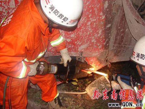 卡車(chē)"四腳朝天"司機(jī)被困 凱里消防營(yíng)救成功(圖)