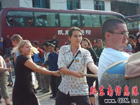拔河比賽是當天的第一個活動,激烈熱鬧的比賽一開始,就吸引了全村人的目光。而正在開覺村旅游的13名外國友人在觀看了比賽后,也興致勃勃要求參加。第一次比賽,外國朋友對陣開覺村村民,由于經驗不足,被村民們拉的“人仰馬翻”。之后,他們找到了訣竅,屢次反敗為勝,最終獲得了冠軍。