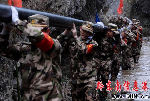 本港訊 (特約記者 黃曉海 攝影報道)2010年4月2日,貴州省丹寨縣“引水入城”抗旱工程進入了攻關階段,一段長達300多米,重達3噸的輸水管道要途經深山里的峽谷,峽谷里流淌著齊腰深的河水,當日的氣溫只有8攝氏度,河水冰涼刺骨。關鍵的時刻,300余名援建武警、消防官兵與丹寨縣應急民兵分隊的戰士們臨危不懼,跳入水中肩扛手抬,用了3個多小時,完成了這一艱巨的任務,為整個引水工程的勝利竣工奠定了堅實的基礎。
