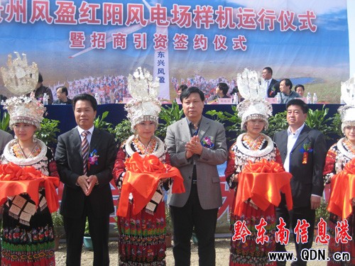 本港訊 (實習記者 鄭旭 攝影報道)2010年4月27日下午3時,臺江縣紅陽草場風電項目樣機試運行儀式在紅陽萬畝草場舉行。州政協副主席吳榮陽,臺江縣委書記楊德濤,縣人大常委主任楊偉,縣委常委、副縣長王剛,縣政協副主席楊昌智出席了儀式。廣東風盈公司董事長羅意自、珠海中恒通公司董事長余永等企業家代表主席了儀式。