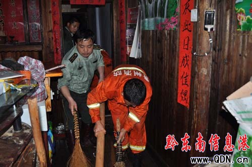 在現場,消防官兵分為三個工作小組,利用機動泵供水,消防出兩支水槍,冒著大雨逐家逐房沖洗房屋內的淤泥,在泥土比較厚的地方,消防官兵還拿著鐵鏟、掃把等工具配合水槍清理泥土。看到消防官兵冒雨沖洗,全身上下都被雨水濕透,且布滿了黃色淤泥,當地居民無不紛紛向消防官兵表示贊許。經過近5個小時的冒雨沖洗,打掃,消防官兵恢復了居民房屋嶄新的面貌。