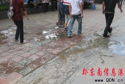 本港訊 (記者 李麗娟 攝影報道)6月7日,記者在路過原凱里師專附中門口時看到,一股污水直往外冒一直流淌過對面的人行道,許多行人也只能捂著鼻子繞道而行。