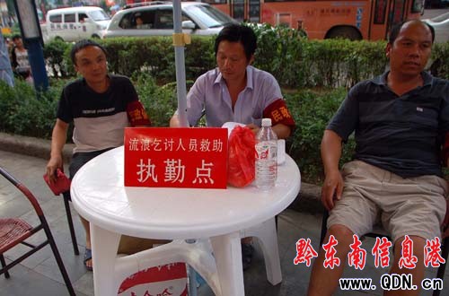 本港訊 (記者 李麗娟 攝影報道)7月17日,記者在凱里大十字附近看到,幾名工作人員正在一處流浪乞討人員救助執勤點執勤。據悉,這樣的執勤點從本月初以來,已在凱里市城區街頭設立了7個。執勤點自設立以來,已救助了多名流浪乞討人員。因流浪乞討人員一直是城市管理的一大難題,為有效解決這一問題,凱里市民政部門特設立了這樣的執勤點,其工作時間從早上8時至凌晨零時許。