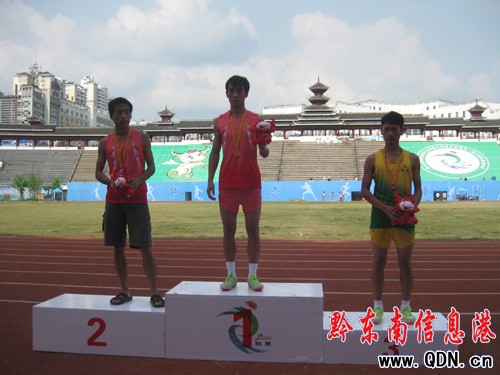 男子甲乙兩組比賽中,各參賽隊員激烈奔跑,最后,凱里龍登弟以2′11″70成績獲得男子乙組800米第一名;劍河龍安鑫以2′07″10成績獲得男子甲組第一名。