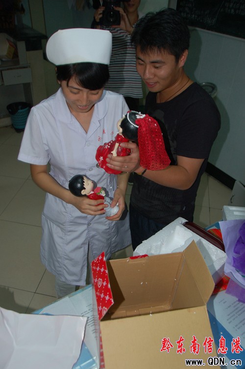 “還有定情之物呀,快打開看看是什么?”人群中有人喊道。王小姐趕緊把包裝盒撕開,看看自己的禮物。李先生發現她力量不夠,撕得慢,于是拿了過來,三下五除二就把禮物拿出來了。原來是一對情侶的塑像!罢媸怯行娜搜!”李先生的朋友贊嘆說。