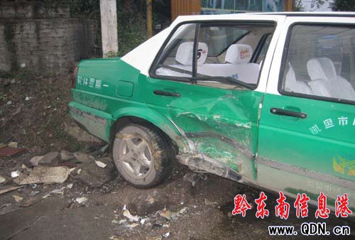據現場目擊者歐先生說,當時出租車正準備轉彎進入二龍墓殯儀館,一輛面包車從三棵樹方向駛向凱里市區,車速頗快,只聽見“砰”的一聲,出租車就被撞到了人行道旁的小山坡上。出租車右邊后車門被撞得深深的陷了進去,玻璃全部破碎,輪胎也被撞得“跑”出來,整個車旋轉了90度。坐在出租車后座的乘客被撞傷。