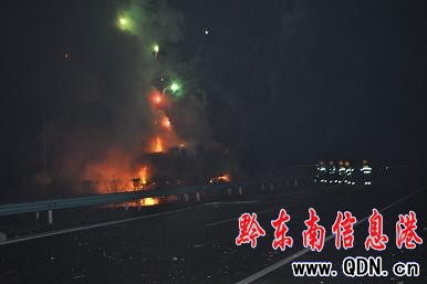 5時(shí)50分左右,救援官兵趕到現(xiàn)場,一輛大型貨車正在猛烈燃燒,伴隨著密集的煙花爆竹爆炸聲,遠(yuǎn)遠(yuǎn)就能看見漫天的禮花在閃爍,現(xiàn)場隨時(shí)可能發(fā)生整體爆炸,一些趕路車輛不顧爆炸危險(xiǎn),仍然繼續(xù)趕路,一些過路車輛卻停在現(xiàn)場不遠(yuǎn)處看熱鬧。大隊(duì)指揮員立即組織人員在距離著火車輛約300米處設(shè)置了警戒線,對(duì)路段實(shí)施了管制,對(duì)圍觀群眾進(jìn)行了緊急疏散。同時(shí),按照“先滅車內(nèi)火,再撲車外火,先保車廂、再救車身,預(yù)防整體爆炸,事態(tài)擴(kuò)大”的戰(zhàn)斗決策,迅速組織消防車輛在安全距離內(nèi)雙干線出水,一支水槍負(fù)責(zé)對(duì)著火車輛車廂內(nèi)的煙花爆竹進(jìn)行澆灌滅火,另一支水槍負(fù)責(zé)冷卻著火車輛油罐,防止油罐爆炸引起車廂內(nèi)所有煙花爆竹整體爆炸,造成人員傷亡,事態(tài)擴(kuò)大。6時(shí)30分左右,火勢得到有效控制,零星煙花還在爆炸,6時(shí)40分左右,大隊(duì)指揮員命令在高速公路邊的小河溝里用機(jī)動(dòng)泵再出一支水槍,對(duì)火魔展開了總攻,7時(shí)05分,火勢得到全面控制,可見明火全面撲滅,車廂內(nèi)煙花爆竹燃爆現(xiàn)象消除,大隊(duì)指揮員命令消防車輛撤離現(xiàn)場,拆除管制,恢復(fù)交通。為了防止車廂內(nèi)陰燃余火的存在,再次引起煙花爆竹燃燒爆炸,命令機(jī)動(dòng)泵小組繼續(xù)利用機(jī)動(dòng)泵出水槍對(duì)車廂進(jìn)行澆灌,直至確認(rèn)再無燃燒爆炸的可能后方可撤離。由于車廂內(nèi)煙花爆竹過密集,頂層煙花爆竹包裝紙軟化覆蓋,澆水無法滲透到底部,7時(shí)30分左右,救援人員決定邊澆水,邊卸下車廂內(nèi)煙花爆竹,達(dá)到全面剿滅殘火的目的。11時(shí)30分,車廂內(nèi)煙花爆竹卸載完畢,殘余火星全部撲滅,事故現(xiàn)場進(jìn)行移交,大隊(duì)救援人員全部撤離。