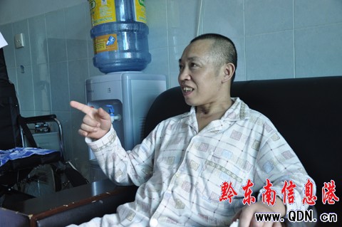 11日上午,記者在州醫院腦外科病房29床看到,一直臥床不起的楊佐權在妻子的攙扶下,已經能下床行走了。坐在沙發上的楊佐權看上去精神狀態還不錯,時不時露出燦爛的笑容,能自己吃東西,還能與人簡單的對話,當記者談到他所喜愛的教育事業時他總能發自內心“仰頭大笑”。