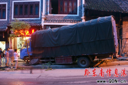 10日凌晨2時許,一輛解放大卡在鎮(zhèn)遠縣城東下長坡入城時失控,沖出路肩,壓過兩株行道樹后,把一棟民房的一面墻撞出一個大豁口,繼而前沖,撞在緊鄰的另一棟民房上。車子嚴重變形,駕駛室被嚴重擠壓,所幸駕駛員安全逃生,未受重傷。