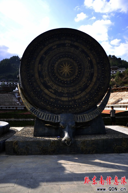 雷山民族文化廣場座落在雷山縣城的北面,呈長方形,東西向。主體圖案為一個大圓圈上均衡地分布著八個圓圈圍繞著中心一個圓圈,象征著雷山縣的九個鄉鎮,也象征著蚩尤時代的苗族先民九黎氏族。四角是綠化地。在九個圓圈的東側,是一個大圓圈。由此有人說它象征苗族神話中的十個太陽從遠古座落到了今天的丹江河畔。在往東,則是呈半圓形的水池,與圓圈有綠化離帶隔離。東西向正中間為主干進出通道,從沿河的公路穿過廣場,透過中大街直達撮箕形青瓦蓋頂長廊的民族體育場。(張鴻)