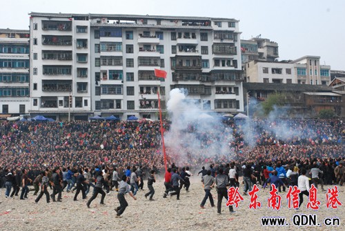 2月19日,從江縣物資局碼頭人頭攢動熱鬧非凡,貴州省從江縣第十四屆花炮節在這里隆重舉行。下午14時搶花炮正式開始,經過兩個小時的激烈爭搶,近萬人參加的搶花炮,象征官運的“金龍一炮”、象征財運的“玉龍二炮”、象征鴻運的“銀龍三炮”各有得主。