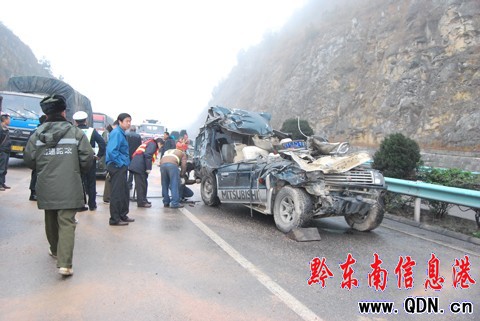 本港訊 (王臨愷 馬艾青 記者 劉仙 攝影報道)1月29日上午9時許,滬昆高速公路1707公里處(凱麻段麻江至下司之間)下行線發生惡性交通事故,一輛小車行至事發處失控撞擊路邊波形護欄,結果引發了多車追尾,造成了2人死亡,8人受傷事故,交通中斷約3個半小時。據悉,事故發生時,一輛載滿16噸汽油的油罐車險些被一輛掛車重重撞擊,危急時刻,掛車駕駛員“自殺性”撞向護欄,油罐車司機也緊急自救,避免了不堪設想的后果。