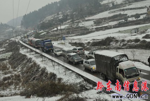 1月17日上午,黔東南州凱里市又迎來今年第三輪低溫大雪和凍雨天氣,1月17日下午4點左右,境內308省道278公里至285公里大部分路段路面出現嚴重結冰,致2000多輛汽車被堵在長達6公里的公路上。凱里公路管理段32名路政除冰突擊隊員迅速趕赴現場,頂著大雪,忍受饑寒,采取撒鹽化冰、救助車輛等措施,于當晚10點過,疏通所有滯留車輛。 (陳沛亮)