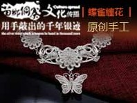 銀飾展示——蝶雀纏花。蝴蝶和鳥都是苗族崇拜的的圖騰,這些生靈與人的思想相互關(guān)系,純樸自然的意識,印證的也不過是返璞歸真,讓我們的心性和生命回到最純真的狀態(tài),感觸最初的美麗。