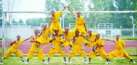 騰訊消息 世界杯正如火如荼的在南非進(jìn)行,廣受球迷喜愛的梅西[博客]牽動(dòng)著中國球迷的心,同時(shí)也在中國引起了一股踢足球的熱潮。近日在河南登封,少林寺塔溝武校的足球校隊(duì)也開展了自己的足球課程,足球隊(duì)全部由塔溝武校的男生組成,最大的19歲,最小的才15歲,結(jié)合每個(gè)人的專長,來分配場上的11個(gè)位置,他們在鄭大體院登封校區(qū)足球場進(jìn)行了訓(xùn)練,在綠茵場上,黃色武僧袍,非常養(yǎng)眼。