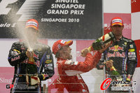 騰訊體育訊 2010年9月26日 世界一級方程式錦標賽第15站——新加坡大獎賽的正賽于今晚20點在瑪麗娜灣賽道進行,阿隆索在發車之后就一直領跑全場,馬薩和韋伯在比賽伊始的戰術賭博都獲得了成功,而小漢在第36圈撞車退賽,讓韋伯穩居第三。最后,經過61圈的爭奪,法拉利車隊的阿隆索拿到本站的冠軍,這也是法拉利車隊本賽季的第四個分站冠軍。紅牛車隊的維特爾落后不到一秒排名第二,他的隊友韋伯、邁凱輪車隊巴頓位列第三和第四。