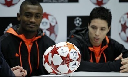騰訊體育訊 北京時間2011年3月4日凌晨,2010-2011賽季歐冠聯賽決賽官方比賽用球在英格蘭溫布利大球場揭開面紗。切爾西射手卡勞和阿森納中場納斯里出席發布儀式。
