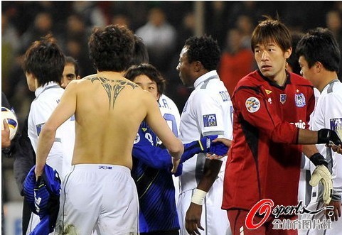 大阪鋼巴一次對盧西亞諾的背后犯規,引發了雙方球員的爭執。好在李瑋鋒等人迅速化解了雙方的緊張氣氛。不過,攝影記者還是捕捉到了陳濤與對方教練的沖突畫面。下半場,陳濤被遠藤保仁從背后放倒,直接被抬出場外治療,后被隊友替換下場。