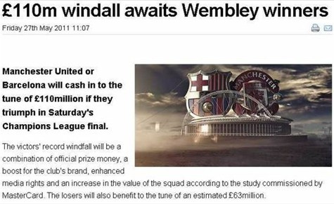 這份報告的作者西蒙-查德威克教授說:“對大部分球迷來說,曼聯對陣巴薩是一場夢幻決賽。他們同時也是場外經營最成功的兩家俱樂部。他們加起來能獲得2億歐元(1.73億英鎊)的收入,本次歐冠決賽是歐洲足球史上獲利最豐的一次決賽!