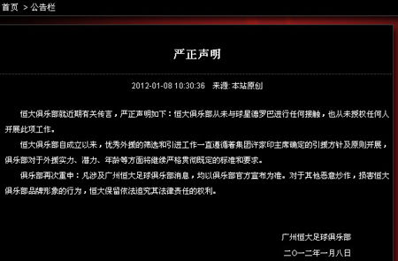 恒大俱樂部就近期有關傳言,嚴正聲明如下:恒大俱樂部從未與球星德羅巴進行任何接觸,也從未授權任何人開展此項工作。