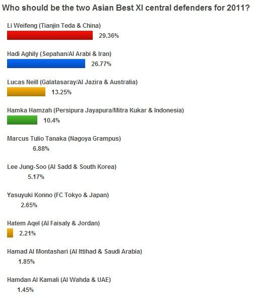 GOAL.COM公布了2011年亞洲足壇各項最佳的評選結(jié)果,李瑋峰以29.36%的得票率成為亞洲最佳中后衛(wèi)。