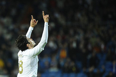 開場后10分鐘,卡卡就兩次為C羅制造機會,這顯示了卡卡這一晚的良好感覺。第36分鐘,卡卡的精彩表演達到了巔峰狀態,馬塞洛回做,卡卡在大禁區左側上得球后,抬頭看了下對方門將,稍微調整一下,即挑射遠角,皮球劃出美妙弧線后,從球門右上角飛進球門。伯納烏萬眾沸騰,卡卡雙手手指指天,感謝老天的幫助,不過他的臉上并無太多的笑容。馬塞洛從背后抱住卡卡表示祝賀,C羅、阿爾騰托普、格拉內羅等隊友也趕了過來,不過,卡卡始終顯得很冷靜,與此同時,伯納烏球場的歡呼聲和掌聲直沖云霄。