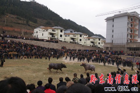 本港訊 (記者 楊驥 攝影報(bào)道)大年初五(2月18日),翁義村民族民間斗牛賽繼續(xù)進(jìn)行,當(dāng)天舉行A組牛的比賽。比賽中,翁義本村的8號碰牛打跑了4頭斗牛而稱王。但斗牛過程中,打敗的牛不斷跑進(jìn)人群中,牛到之處,人倒一片,萬幸的是沒有人因此傷亡。