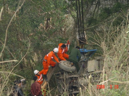 據(jù)介紹,事發(fā)后,鎮(zhèn)遠(yuǎn)消防大隊負(fù)責(zé)人呂正權(quán)帶著官兵于10時10分趕到了事發(fā)地點。經(jīng)過偵察,發(fā)現(xiàn)肇事車輛公路下的斜陂上,車身已側(cè)翻,車頭撞到公路護(hù)攔和樹木后,已嚴(yán)重變形,駕駛員兩腿被方向盤死死夾住,上身懸于空中,另一名在車翻時被甩出車外壓于車底。據(jù)當(dāng)?shù)厝罕姺Q,此車于早晨7時左右發(fā)生事故,由于報警晚,經(jīng)醫(yī)務(wù)人員診斷已經(jīng)死亡。