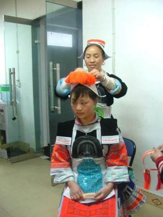 圖:苗族大媽也不遜色,老姐們正在幫忙打扮