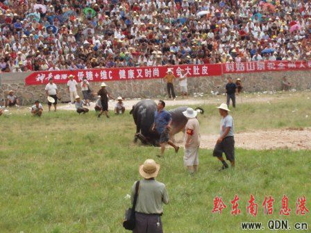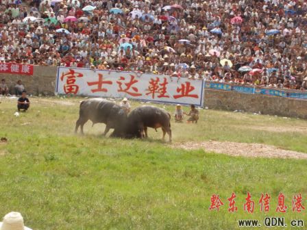 由于此次比賽實行不拉腳,一架出勝負淘汰制。所以比賽精彩場面不時出現,尤其是舟溪11號牛和來自大中的1號牛角逐異常激烈,由于兩牛的實力相當,所以斗了很長一段時間,都沒有角出勝負,斗牛場都被它們掀起大股煙塵,頭也撞得血流。猶如戰場硝煙滾滾下廝殺的戰將。看臺上的人們也按奈不住自己的激情,場上歡呼聲,吶喊聲此起彼伏。最終舟溪11號牛憑著自己精湛的技藝和作戰經驗,將對方打跑了。這時,場上爆發出雷鳴般的掌聲。