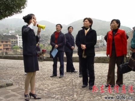 古城導游向州委副書記紀委書記韓卉等領導介紹古城景點“整臟治亂”工作情況
