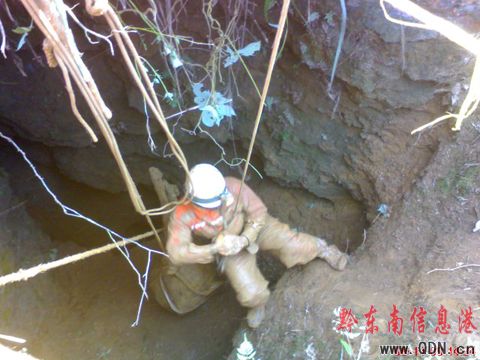 由于洞底是一個泥塘,在救助小組未到達現場時當地群眾在救援的時候繩索斷裂使黃牛陷入泥潭這樣給救援工作帶來了一定的捆難。這時洞下施救的兩名隊員經過短暫的商量后,經過20分鐘的努力下終于把繩索捆綁在黃牛身上,救援人員立即用對講機通知副中隊長劉毅讓上面的人將黃牛拉上去。就在拉的時候黃牛被卡住在了一個小的轉角處,由于轉角口較小小黃牛無法拉上去,救援人員立即向老鄉借來斧頭將轉角擴寬。經當地群眾和救援人員的努力下終于拉出一頭黃牛。有了第一次成功的救援經驗第二頭黃牛很快的被營救回到地面,救援順利完成。