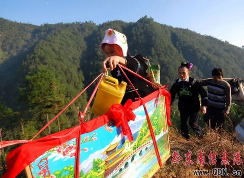 本港訊 (陳沛亮 攝影報道)11月8至19日,凱里市三棵樹鎮大烏燒村苗族同胞舉行13年一次的“牯藏節”,當地家家親友、客人匯聚,舉行11天的隆重祭祀和蘆笙舞等活動。圖為11月8日,苗族同胞挑著禮物到凱里市三棵樹鎮大烏燒村參加“牯藏節”和燃放火炮、宰雞殺鴨招待參加“牯藏節”的客人。