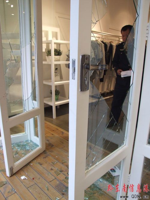 本港訊 (記者 吳勝成) 20日,凱里市中博商業區的某服裝店內,一年輕男子突然闖入,瘋狂地將該店玻璃門及收銀臺砸碎后匆忙逃走。目前,警方正在對這一打砸事件展開調查。 當日下午3點許,記者趕到事發現場時,前來處理的民警剛剛離開。商店門前的地面上還殘留著很多血跡和被砸碎的玻璃,商店的員工,被嚇得臉色蒼白。該店一員工稱,鬧事男子一進店就砸外面的玻璃門,并將兩道玻璃門砸破,隨后,該男子瘋狂的又將收銀柜臺砸碎。據店員稱,店鋪遭打砸與一家物流公司員工有關。 據附近店員稱,當時人來人往的,大家都在做生意,突然就聽見噼里啪啦一陣響聲,過來一看,該店已經被砸了,來砸店的男子由于手受傷爾后跑離現場。