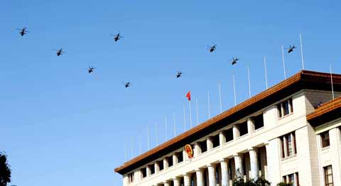 2009年9月21日上午11時,北京晴空萬里,參加國慶60周年閱兵空中梯隊在天安門廣場上空進行精彩、完美預演。
