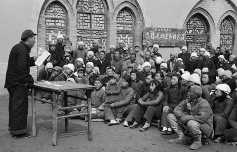 1953年,山西省黎城縣仵橋村全村群眾大會上,原玉魁區(qū)長向群眾講解婚姻法的政策。