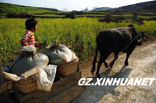貴州黔西南布依族苗族自治州興仁縣豐巖村,一名兒童趕著牛車拉水回家(2010年2月23日攝)。新華社記者 劉續 攝