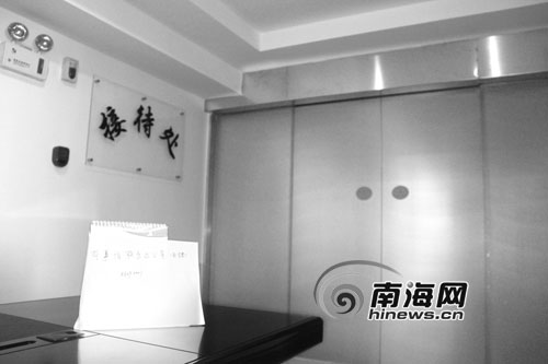 27日下午,記者來到三亞市綜合執法局辦公大樓。剛走出6樓電梯,就看到電梯門口前面擺放著一張辦公桌,墻上有“接待處”的提示牌。桌上放著一部電話,旁邊的臺歷上貼著一張紙條,上面寫著:有事請到5樓辦公室,并留有一個電話號碼。電梯口左邊的通道上,一道玻璃門擋住了前往局長辦公室的路。